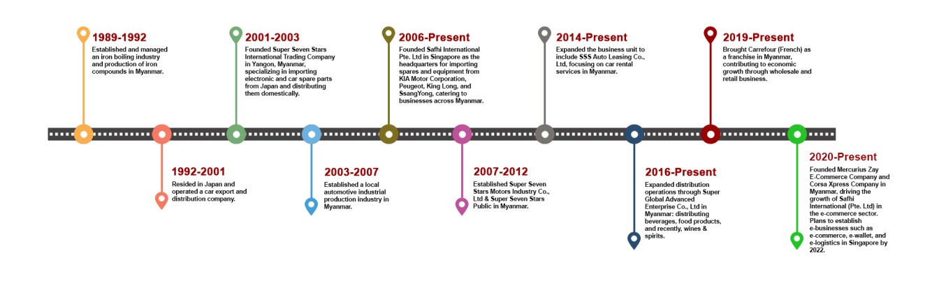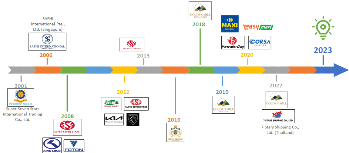 Established in 2001, Super Seven Stars is a dynamic multinational conglomerate that boasts a workforce of over 1,200 talented individuals. With a strong presence in Myanmar and Singapore, we engage in diverse industries, laying the foundation for our core business operations. Originating as a trading company specializing in the sales of Japanese electronics appliances and the importation of cars and spare parts, Super Seven Stars has embarked on a transformative journey. Today, our endeavours extend far beyond trading, encompassing a wide range of sectors, including manufacturing, retail, distribution, and beyond.
